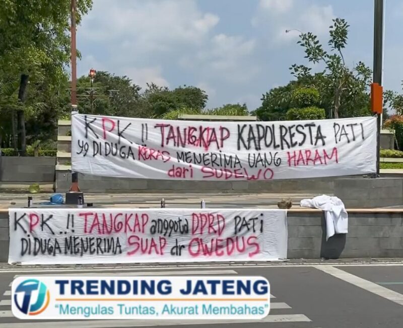 Dua tokoh penggerak AMPB, Botok dan Teguh Supriyanto, memimpin aksi dengan membentangkan spanduk berisi tuntutan keras. Spanduk tersebut secara spesifik menuding Kapolresta Pati diduga keras menerima aliran dana dari Sudewo —mantan Bupati Pati yang kini telah berstatus tersangka Kasus Pemerasan/Pungli Jual Beli Jabatan.