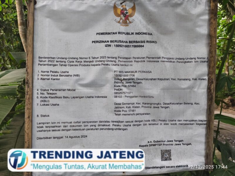 KLATEN – Aktivitas penambangan Galian C oleh PT Wis Makmur Perkasa di Desa Beteng dan Karangnongko, Klaten, menghadapi sorotan tajam. Meskipun perusahaan memajang plang Izin Berusaha Berbasis Risiko dari sistem Online Single Submission (OSS), pemerhati lingkungan dan Rakyat Pemberantas Korupsi Republik Indonesia (RPK RI) menuding izin tersebut belum final dan digunakan untuk menutupi eksploitasi alam yang ugal-ugalan.