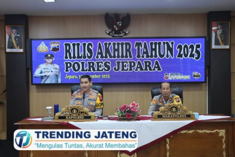 JEPARA – Menutup kalender tahun 2025, Kepolisian Resor (Polres) Jepara menggelar konferensi pers rilis akhir tahun di Mapolres Jepara pada Rabu (31/12/2025). Kapolres Jepara, AKBP Erick Budi Santoso, memaparkan capaian kinerja kepolisian yang mencatatkan tren kenaikan signifikan dalam pengungkapan berbagai kasus besar.